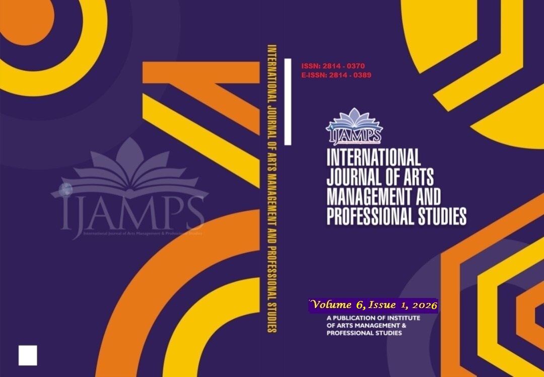 International Journal of Arts Management and Professional Studies (IJAMPS) is an academic Online Open Access Peer Reviewed International Journal domiciled with the Institute of Arts Management and Professional Studies which is approved by the Federal Ministry of Education and accredited by Corporate Affairs Commission (CAC) under the Federal Republic of Nigeria CAM Act No. RC1329612. 1990,The International Organization for Standardization (ISO) with ISO number is NG682640, Euro-American Joint Accreditation Services (EA-JAS), World Safety Organization (WSO) with accreditation number: #024548,...